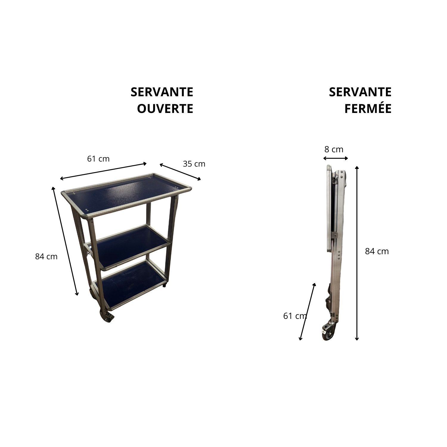 Une servante à 3 plateaux est un chariot de service utilisé à bord des avions pour transporter repas, boissons, et équipements divers.